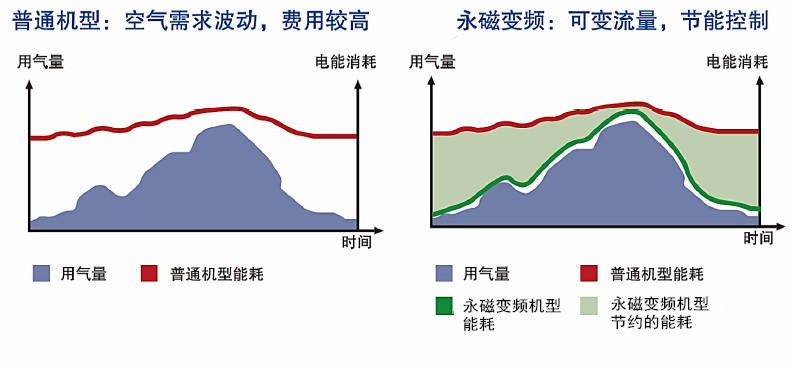 空壓機能耗費用一般要占到使用周期整體費用的82%左右,空壓機的電費可能高達工廠全部電費的40%以上。長期的跟蹤證明,大部分用戶的壓縮空氣需求在不同日期,不同時間或不同月份都有40%-80%的大幅波動。